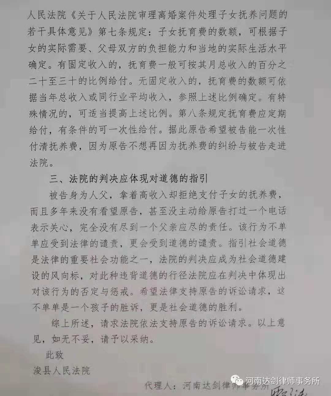 为了保护儿童、妇女权益,国家各行政区域建立有法律援助中心。受浚县法律援助中心指派,河南达剑律师事务所指定,栗律师在该案件中担任原告即两个年幼孩子的一审诉讼代理人。而且作为法律援助案件的律师,栗律师在代理期间没有收取当事人任何费用,一直尽心尽力为当事人争取合法权益。终于功夫不负有心人,经过不懈努力,该案件得到了一个满意的结果,同时也获得了当事人的高度赞扬,河南达剑律师事务所以此为傲。 从这个并不容易的抚养费纠纷案件中,折射出的是栗律师高尚的职业操守与执业精神,这样的人格彰显的是律师荣光,维护的是法治社会。 正如“河南达剑律师事务所”的名字,“达剑”,即达摩克斯之剑——正义之剑,寓意捍卫法律尊严,维护社会公平正义。我所在秉承受人之托、忠人之事的理念基础上,以人为本,以专业为本,以维护当事人权益为本,进而服务社会,回报社会,为建设法治社会献力献策。 |